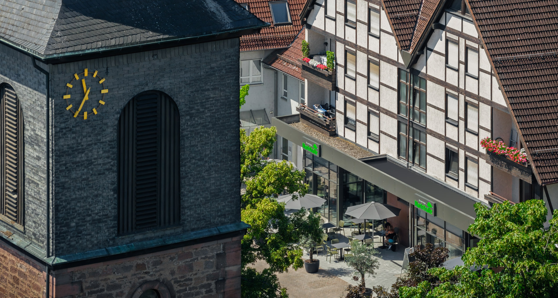 Die Markthalle liegt in der Ortsmitte – gut erreichbar zu Fuß, mit dem Fahrrad oder dem Auto. In unmittelbarer Nähe befinden sich Parkmöglichkeiten sowie Haltestellen des öffentlichen Nahverkehrs.