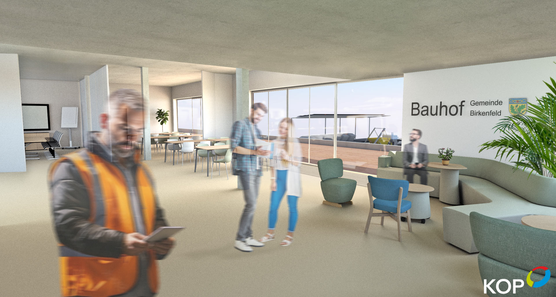 Auf Ebene 1 befinden sich die Bürobereiche für die Arbeitsvor- und -nachbereitung der Arbeitsplanung – dem Kernstück der neuen Arbeitsorganisation. Angrenzend sind Besprechungs- und Seminarräume sowie ein Aufenthaltsbereich vorgesehen, die auch für Schulungen und Offsite-Meetings der Kommune oder Externer genutzt werden können.